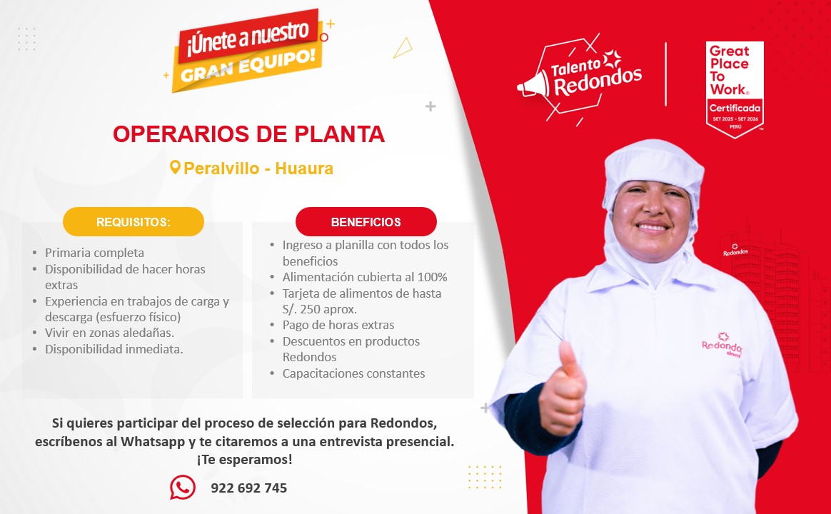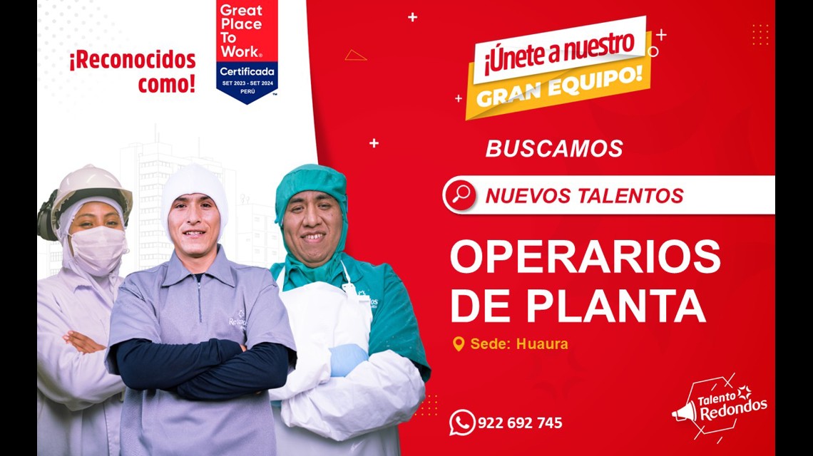 Somos la empresa Redondos, una de las principales empresas del rubro pecuario dedicada a la producción y comercialización de alimentos cárnicos. Actualmente nos encontramos en busca de Operarios de Planta - HUACHO